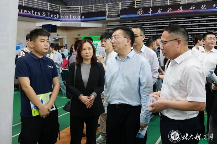 【林大网讯】(文/招生就业处)4月19日下午,学校因“林”相遇·筑梦湖湘“校友回湘”春季校友企业大型专场招聘会在体育艺术馆举行,230余家校友企业携7000余个岗位进校招聘,近2000名毕业生参会。副校长王忠伟、省教育厅“校友回湘”工作专班执行主任周韶锋出席活动。